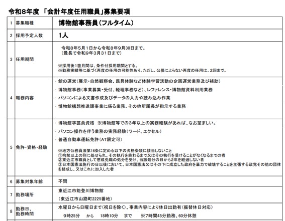 能登川博物館では令和8年度東近江市会計年度任用職員(博物館事務員、フルタイム)を募集しています。